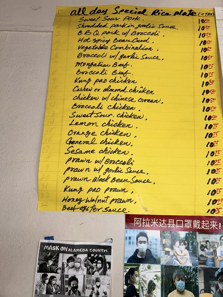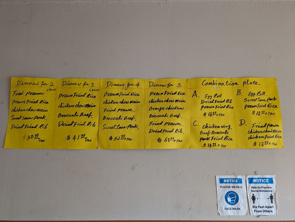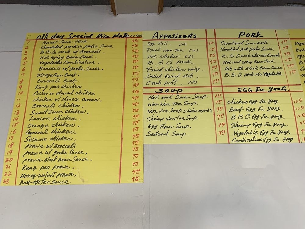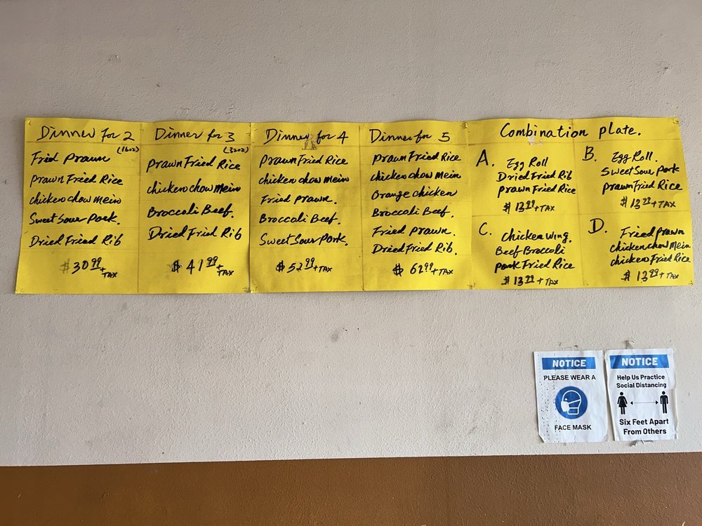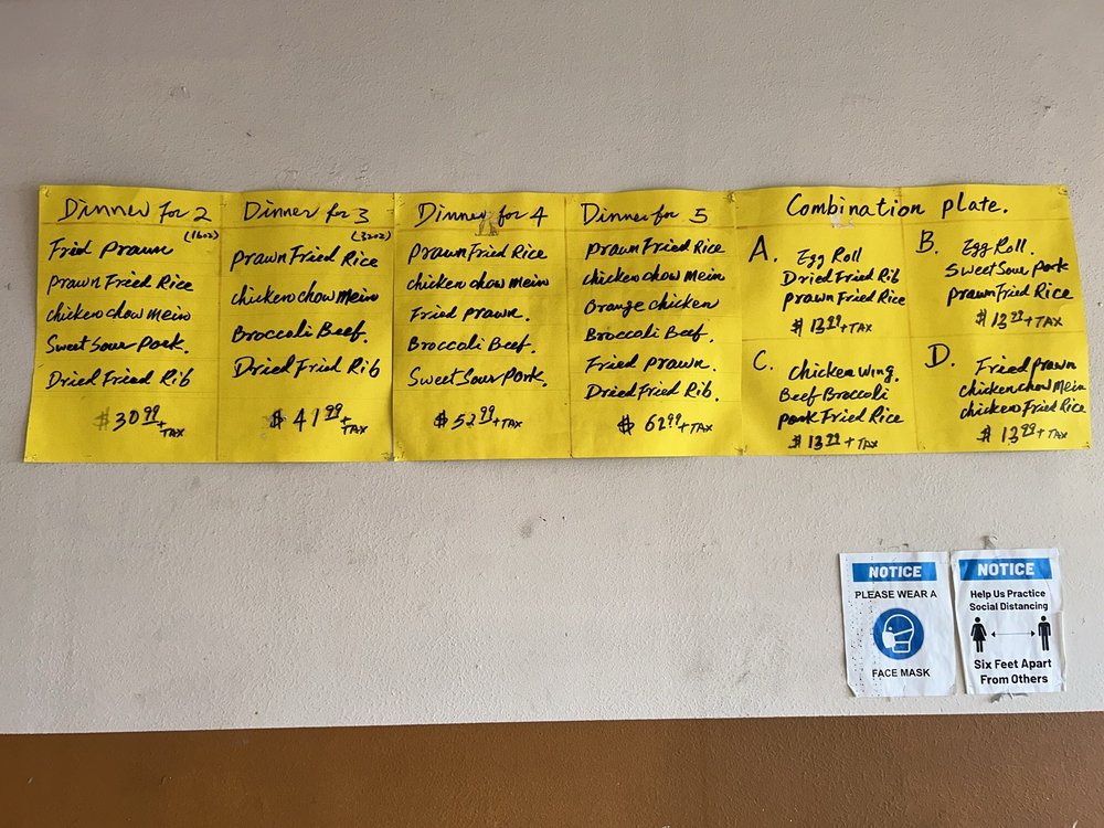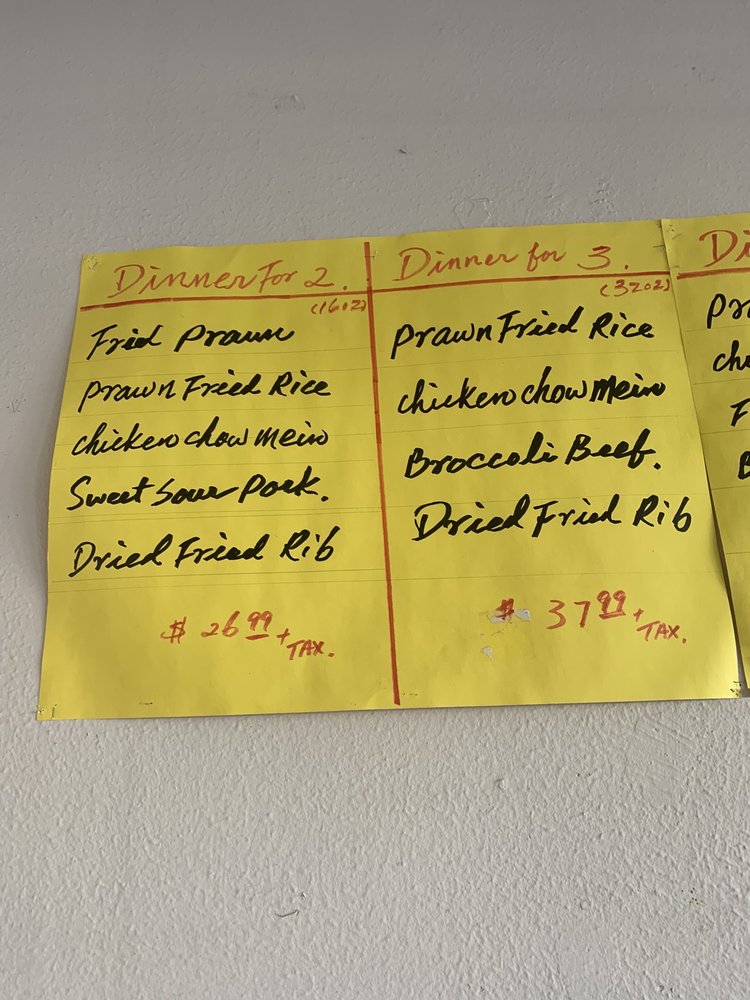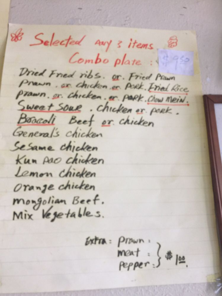 Fried prawn, orange chicken, chicken chow mein, prawn fried rice, broccoli beef, dry fried rib.